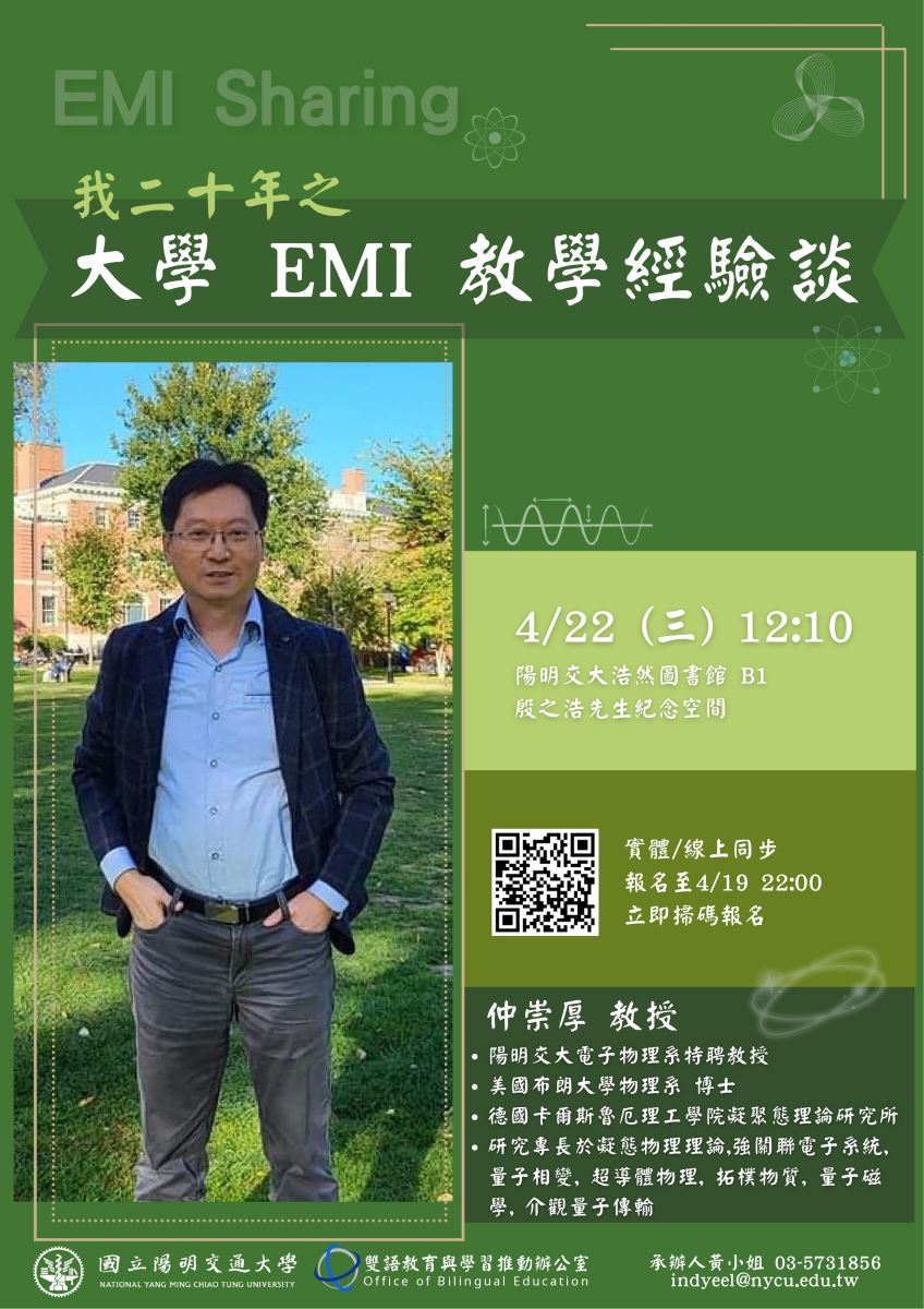 國立陽明交通大學雙語教育與學習推動辦公室訂於115年4月22日(星期三)中午12:10~13:00辦理EMI教師分享會,講題:「我二十年之大學 EMI 教學經驗談」